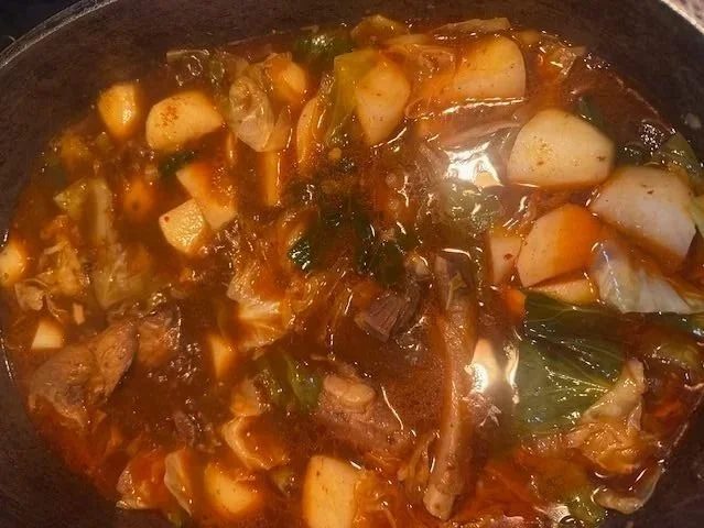 5. Then add your onion, cabbage, doenjang, miso, red hot pepper flakes, black pepper, soup soy sauce, mushrooms, and boil on high, covered. Approx. 10 minutes, then add potatoes if your pork is tender. Then cook potatoes until desired softness.